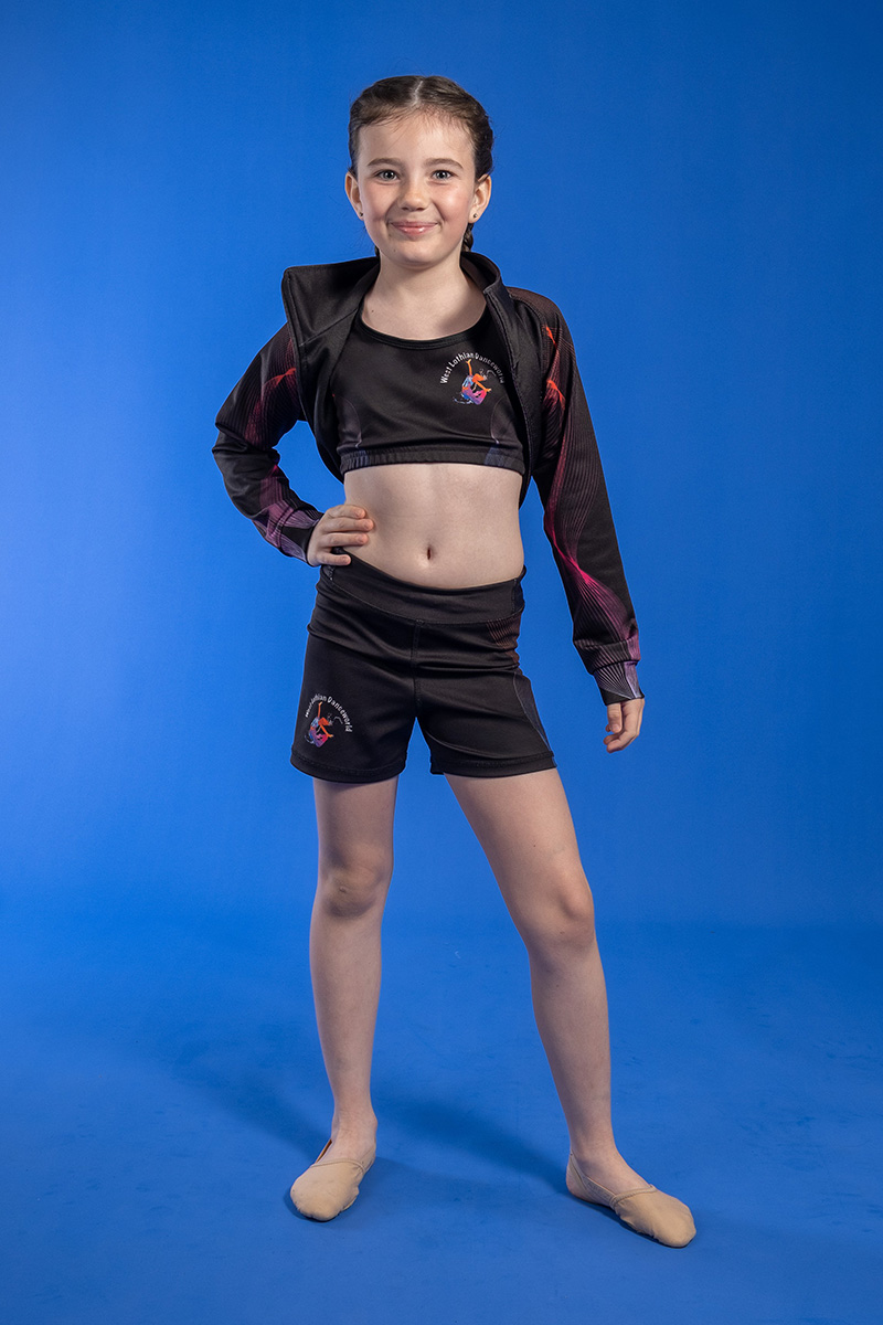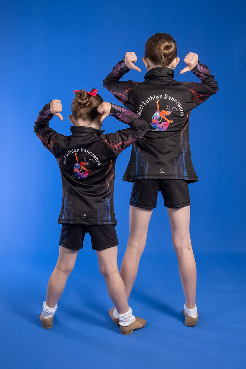 Acro – Bare feet, Danceworld crop top or t-shirt, black shorts or leggings and Danceworld zipper or hoodie.