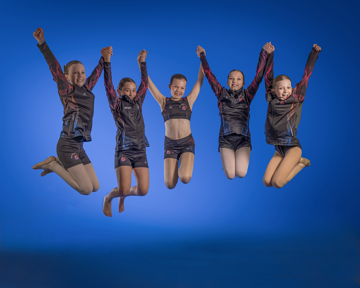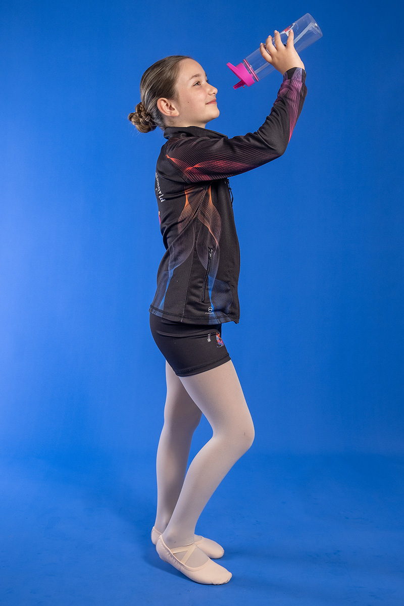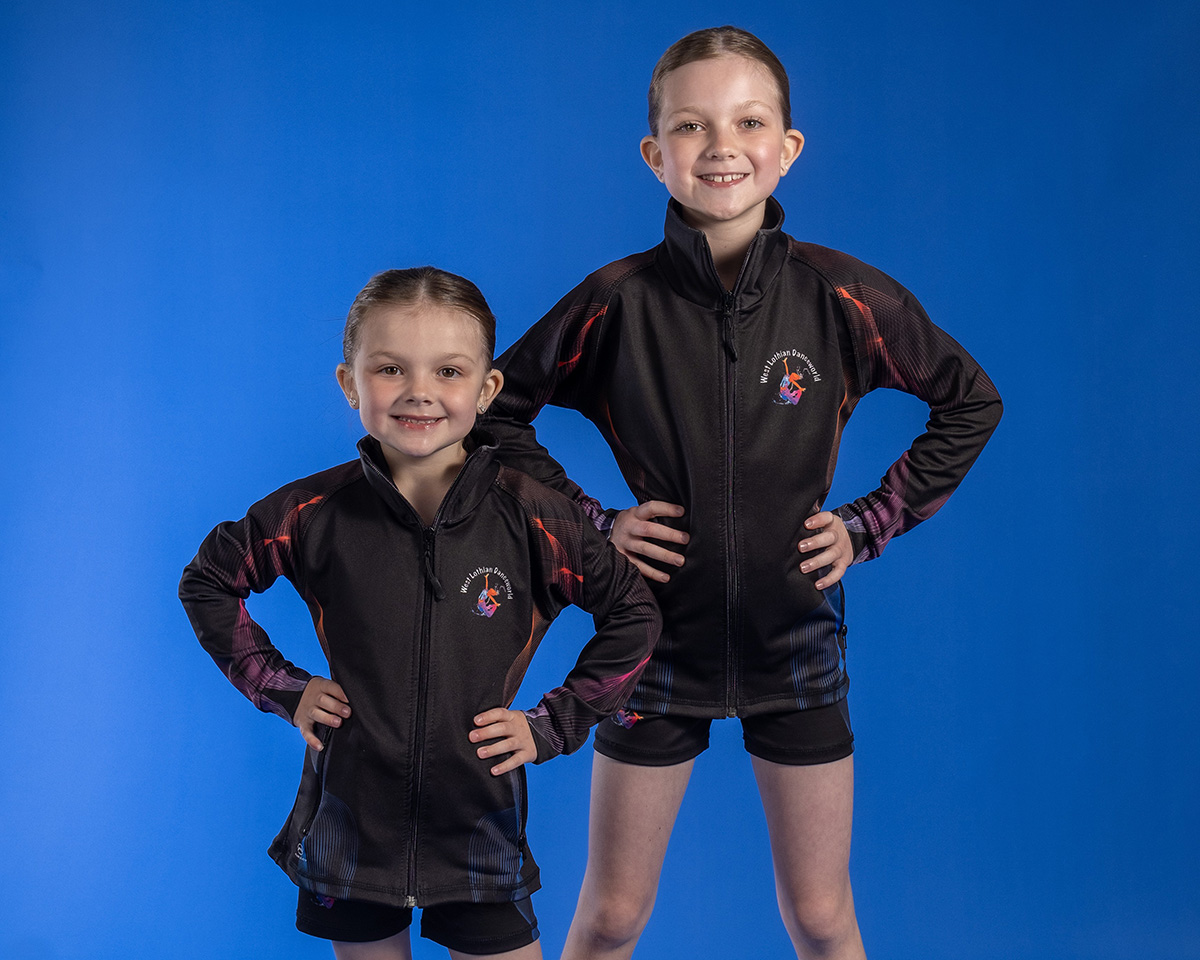 Tumblers Acro – Bare feet, Danceworld crop top or t-shirt, black leggings or shorts and Danceworld zipper or hoodie.